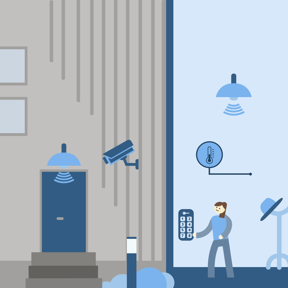 Sensorer kan bruges til mange forskellige formål. For eksempel kan din kunde sætte en sensor på døren for at overvåge, om den står åben og lukker værdifuld varme ud. Derudover kan din kunde opnå komfort med en intelligent lås, der automatisk åbner døren, når kundens smartphone nærmer sig. Endnu bedre, så kan det give din kunde mulighed for at lukke håndværkeren ind, mens han er på arbejde.