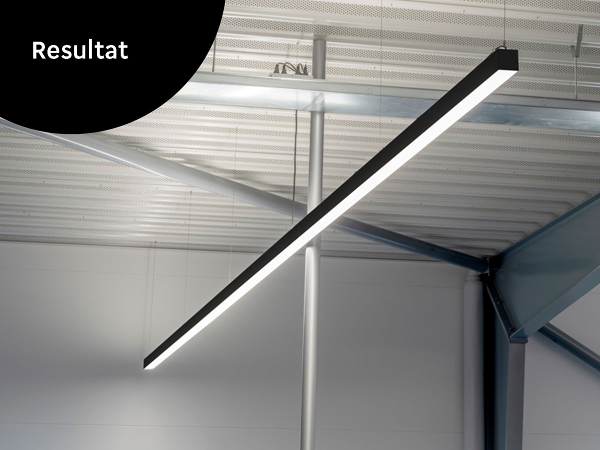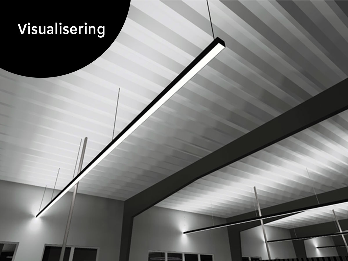 Valget faldt på et oplæg fra Solar Light, hvor 8 meter lange specialfremstillede ”LQ 75” armaturer sikrer tilstrækkelig grundbelysning over arbejdsområderne suppleret med runde og mere dekorative ”Pandora” armaturer i fællesområderne. Alt skulle selvfølgelig være i sort, som er tidens modefarve.